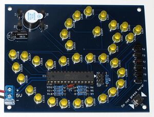 The circuit is controlled by an ATmega8 which multiplexes the LEDs and plays the quack sound when the button is pushed. The speaker is driven with PWM so no digital to analog converter is necessary. The data for the quack sound occupy approx. three quarters of the program memory, the rest is available for the program code and the animations. The project is powered from a 4.5-5 V supply, e.g. three AA batteries.